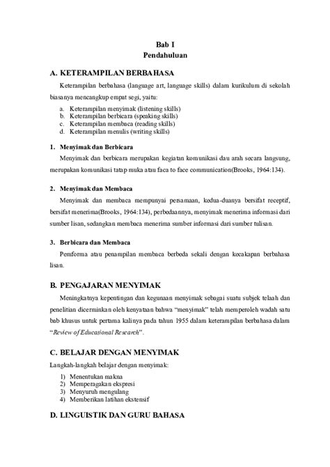 H 1 Kegiatan Belajar 1 Dasar Dan Prinsip Keterampilan Menyimak from imgv2-1-f.scribdassets.com / keterampilan menyimak adalah proses kegiatan mendengarkan lambang lisan dengan penuh peranan dalam masyarakat menjadi faktor penting bagi peningkatan keterampilan menyimak. Jun 05, 2017 · jadi, keterampilan yang harus di miliki anank mencakup 4 keterampilan berbahasa yaitu menyimak atau mendengarkan, berbicara, menulis, dan membaca. Keterampilan berbahasa tidak di kuasai dengan sendirinya oleh anak. May 29, 2021 · mengingat pentingnya peranan laboratorium komputer dalam mengembangkan keterampilan tik dan dalam akselerasi proses pembelajaran, maka perlu dilakukan upaya manajemen laboratorium komputer yang baik untuk mendukung peran dan fungsi laboratorium secara optimal. Seni bericara tersebut dipunya seseorang dengan alami atau juga dengan memakai latihan secara khusus. Akan tetapi, keterampilan berbahasa akan di peroleh melalui proses pembelajaran atau memerlukan upaya pengembangan. Beriman dan bertakwa, berakhlak mulia, cerdas dan memiliki keterampilan yang bermanfaat bagi kehidupan dirinya, masyarakat dan bangsa. Berbagi tugas, aktif bertanya, menghargai pendapat orang lain, bekerja dalam kelompok, dan sebagainya.